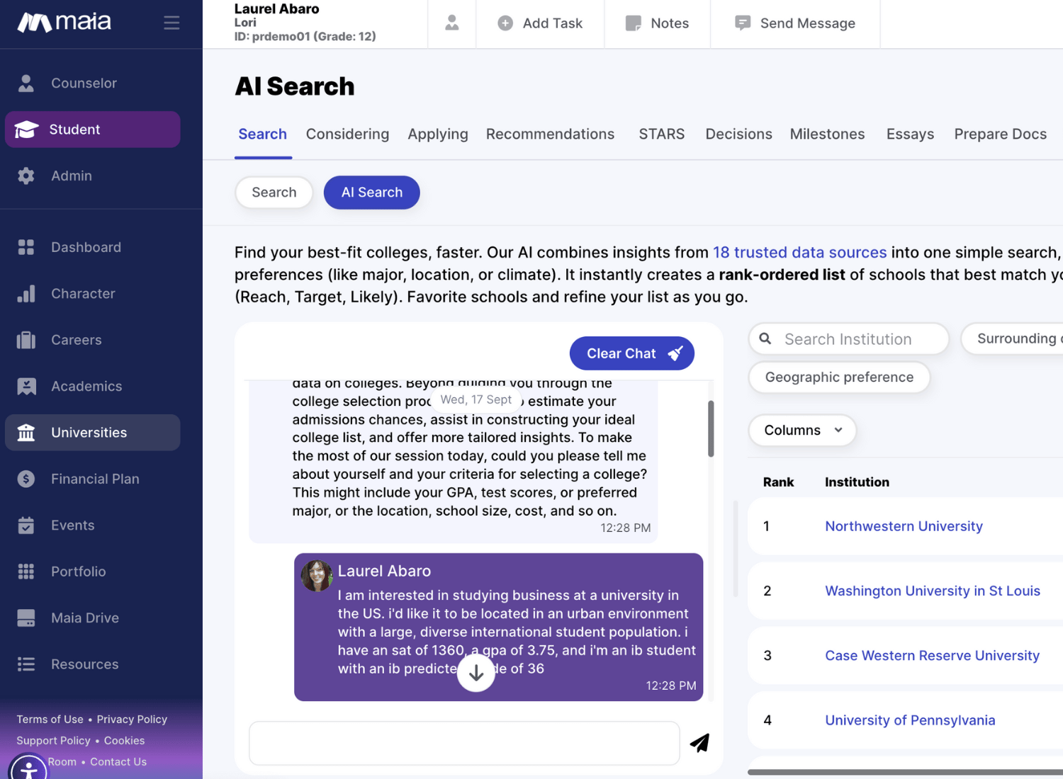 MaiaLearning now includes ethical AI that helps students explore options faster and helps counselors focus on high-value conversations. Conversational search, MaiaChances probabilities, instant essay feedback, and AI-assisted teacher reccomendations give personalized guidance while keeping educators in control.